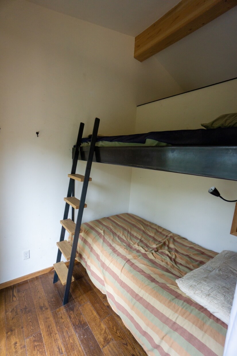 In the newly constructed Main Lodge, there is a shared/partitioned bunk room with several nooks. The Camp Bird nook and the Imogene nooks each have an lower and upper single twin bunk. The Hidden Treasure nook has a double lower bunk and a double upper bunk.